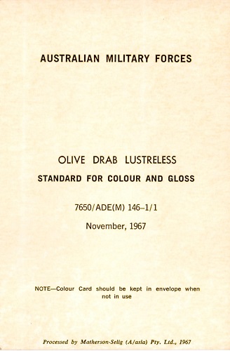 reproduces the correct colour.  In late 2013 REMLR was sent an extraordinary colour swatch which is now kept with the REMLR documents with the Webmaster. These cards are the Master Cards are the  original Australian baseline for Olive Drab paint dated 1967. These cards have the spectrophotometer readings  on them so as to enable the Army or anyone else to manufacture the identical  tint of Olive Drab as applicable to and after 1967.  It is an priceless document that I had no idea would still exist outside of the AWM, and REMLR is extraordinarily thankful to be the custodian such an important document.