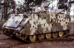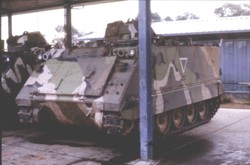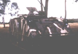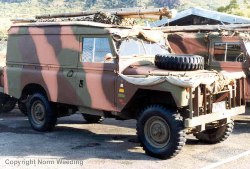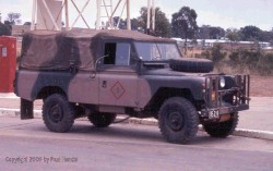 Brown and Tan  The reason for the change was to align the now 3rd Brigade with our area  of operations moreso, being the northern part of Australia.  Everyone  turned their noses up when the vehicles were painted these colours; however, as  the paint started to fade, it became very effective to the extent that its  worked well during Exercise K83 in the Pilbara.  This scheme remained here  in Townsville for some time until the new fleet of Landrovers arrived with the  current cam pattern.  Then everything was painted the traditional cam  scheme.  I was part of the preparation team for both occasions, masking and removing  items prior to painting.  This was a Task Force directed affair, so  everyone who could paint was seconded for this job.  It was a pain when  southern units joined in on some exercises as they wanted their equipment  painted.  The only trouble was, 102 FD WKSP had to return the vehicles  back to base colour prior to them departing Townsville.  I guess this is  what drove the purpose of standardising the fleet to a particular cam scheme.