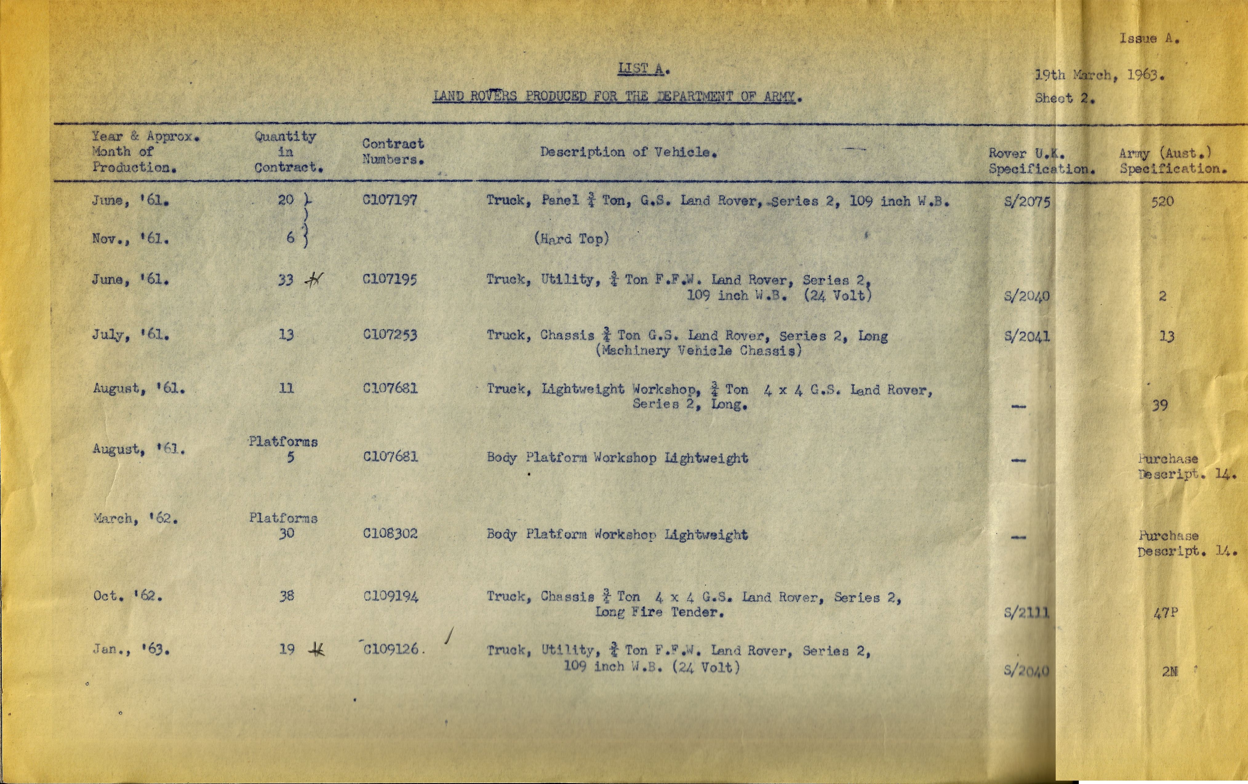 The December 1988 issue of Overlander provided a combined total for Series 2 and 2A purchased by the AMF. It stated that the total was 6,626 units supplied in both 88" and 109" types between "16.12.58" and "9/71". Allowing for the fact that the Australian Army definitely purchased some replacement chassis (for repairs), and that the RAAF purchased a number of series 2a Military Specification vehicles, the Overlander figure could be about right.