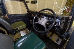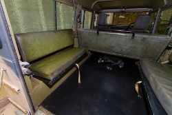 The rear of the vehicle showing the bench seating, bit no battery storage and radio table that is in the senior commander.