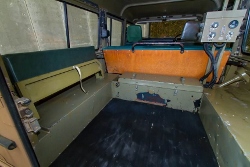 Features: The vehicle has a station wagon type body with a single side hinged rear door and a 'safari' roof with no alpine windows. An auxiliary 28v electrical system is fitted with one bank of batteries in a special enclosure behind the rear seat. A power distribution panel and a mounting tray for radios are provided.