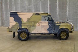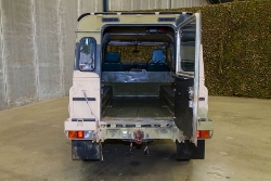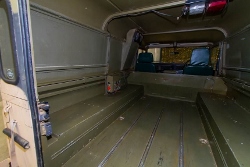 Features: The vehicle has a van type body with a single side hinged rear door and a 'safari' roof with no alpine windows. An auxiliary 28v electrical system is fitted with one bank of batteries in a special enclosure behind the rear seat. A power distribution panel and a mounting tray for radios are provided.