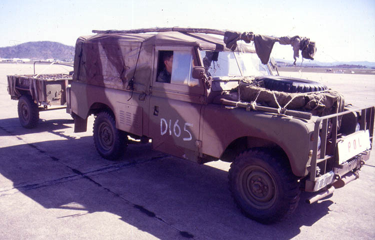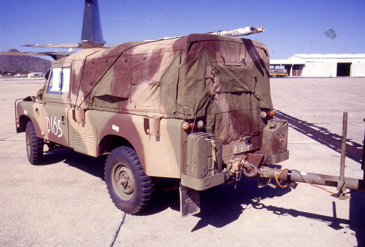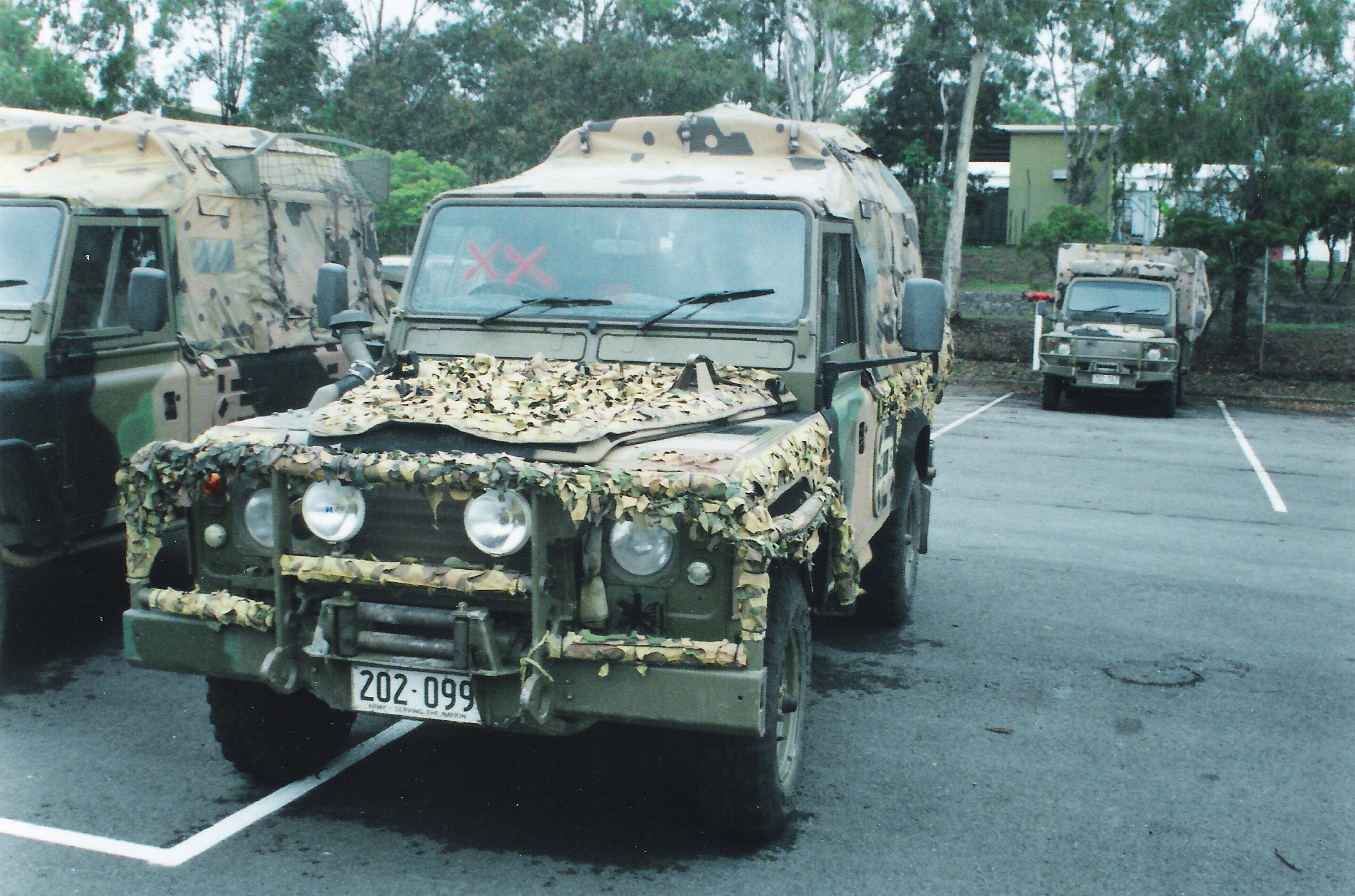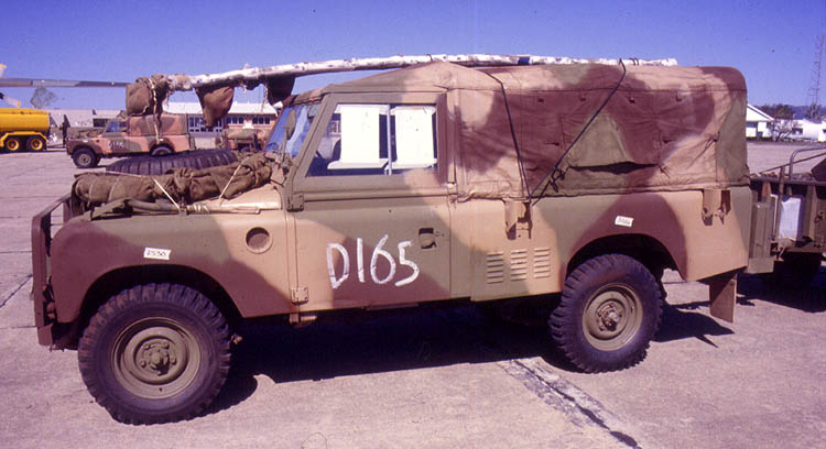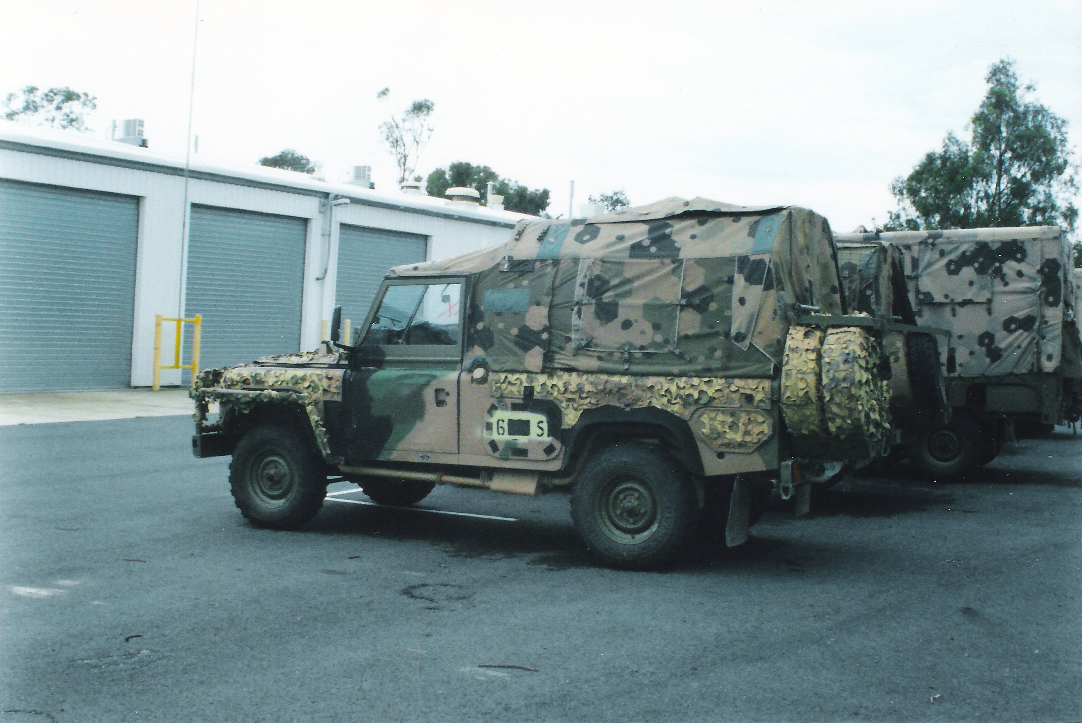 Brown and Tan  The reason for the change was to align the now 3rd Brigade with our area  of operations moreso, being the northern part of Australia.  Everyone  turned their noses up when the vehicles were painted these colours; however, as  the paint started to fade, it became very effective to the extent that its  worked well during Exercise K83 in the Pilbara.  This scheme remained here  in Townsville for some time until the new fleet of Landrovers arrived with the  current cam pattern.  Then everything was painted the traditional cam  scheme.  I was part of the preparation team for both occasions, masking and removing  items prior to painting.  This was a Task Force directed affair, so  everyone who could paint was seconded for this job.  It was a pain when  southern units joined in on some exercises as they wanted their equipment  painted.  The only trouble was, 102 FD WKSP had to return the vehicles  back to base colour prior to them departing Townsville.  I guess this is  what drove the purpose of standardising the fleet to a particular cam scheme.